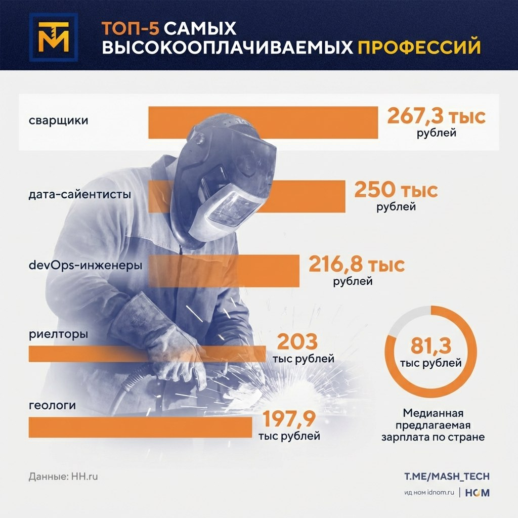 В январе 2026 года рейтинг самых прибыльных профессий возглавили сварщики, медианная зарплата которых составила 267,3 тыс рублей. Об этом говорят данные рейтинга, составленного HeadHunter. https://www.kommersant.ru/doc/8420986
